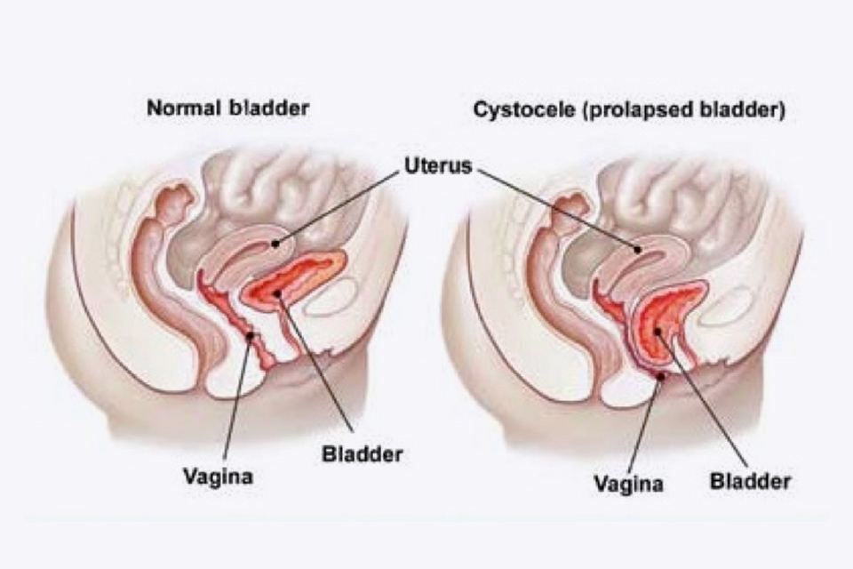 An anterior vaginal wall prolapse (cystocele) causes the bladder to bulge through the front wall of the vagina which can sometimes be seen at the vaginal entrance causing urinary urgency, frequency and incontinence.